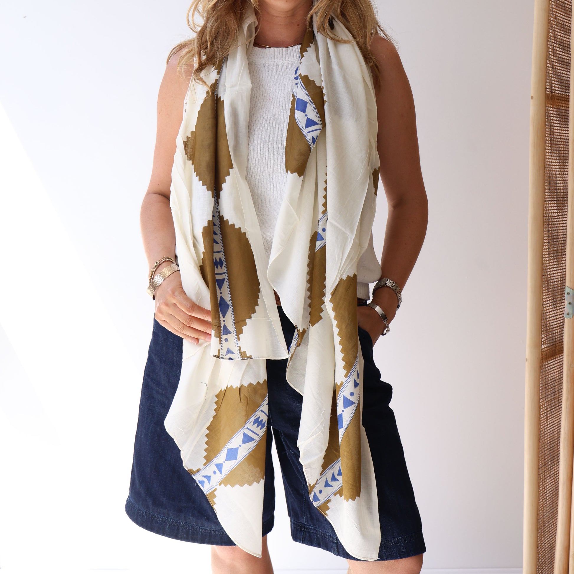 This 100% cotton CHRISTOPHER Olive Multi scarf features a vibrant Mediterranean print and can easily double as a stylish sarong. Its breathable fabric ensures comfort, making it perfect for warm days and versatile enough to complement your wardrobe in multiple ways. Embrace both fashion and function with this adaptable accessory.