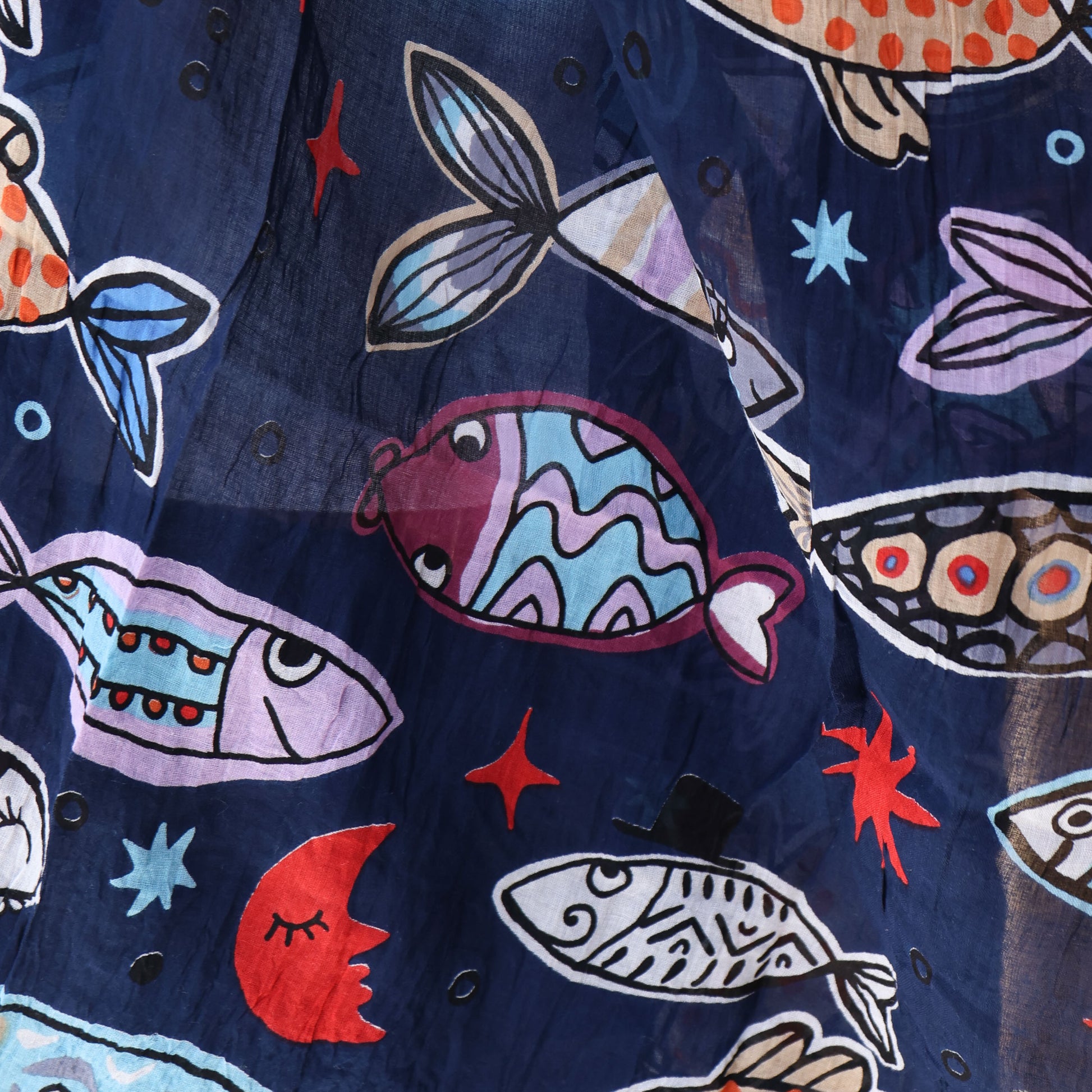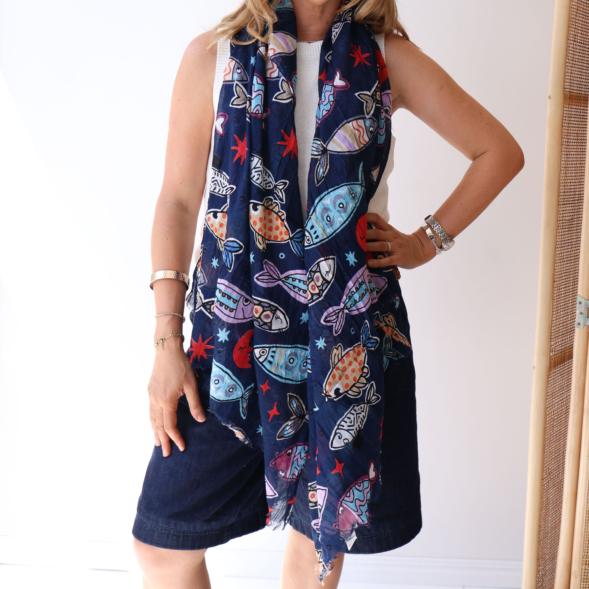 This CINON Blue Multi scarf is crafted from 100% cotton, offering a soft, breathable feel ideal for all-day wear. Featuring the season's standout fish print, it adds a fresh, nature-inspired touch to your outfit. Its lightweight fabric makes it perfect for layering, providing both comfort and style throughout the year.