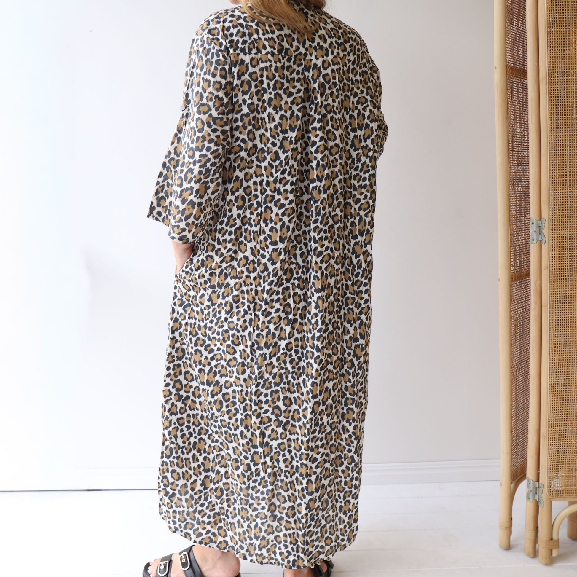 The CLARA Leopard dress is crafted from soft viscose fabric featuring a delicate poppy print. Designed in one size, it allows you to customize the fit by cinching the waist with the matching tie belt. For added versatility, the sleeves can be rolled up and secured with a tab and button, making it perfect for changing weather or casual looks while keeping you comfortable and stylish.