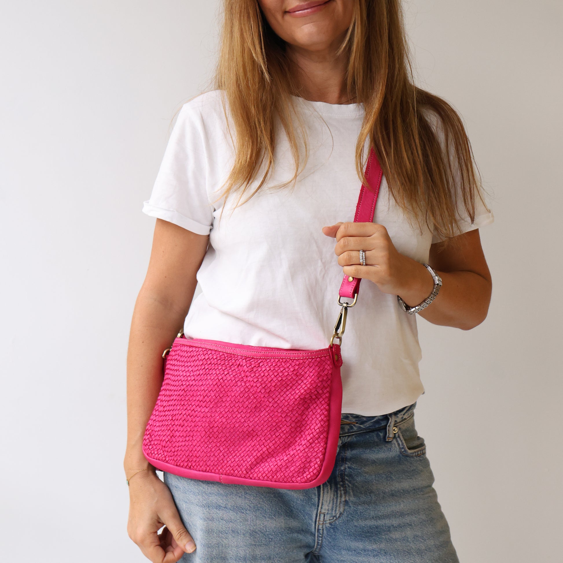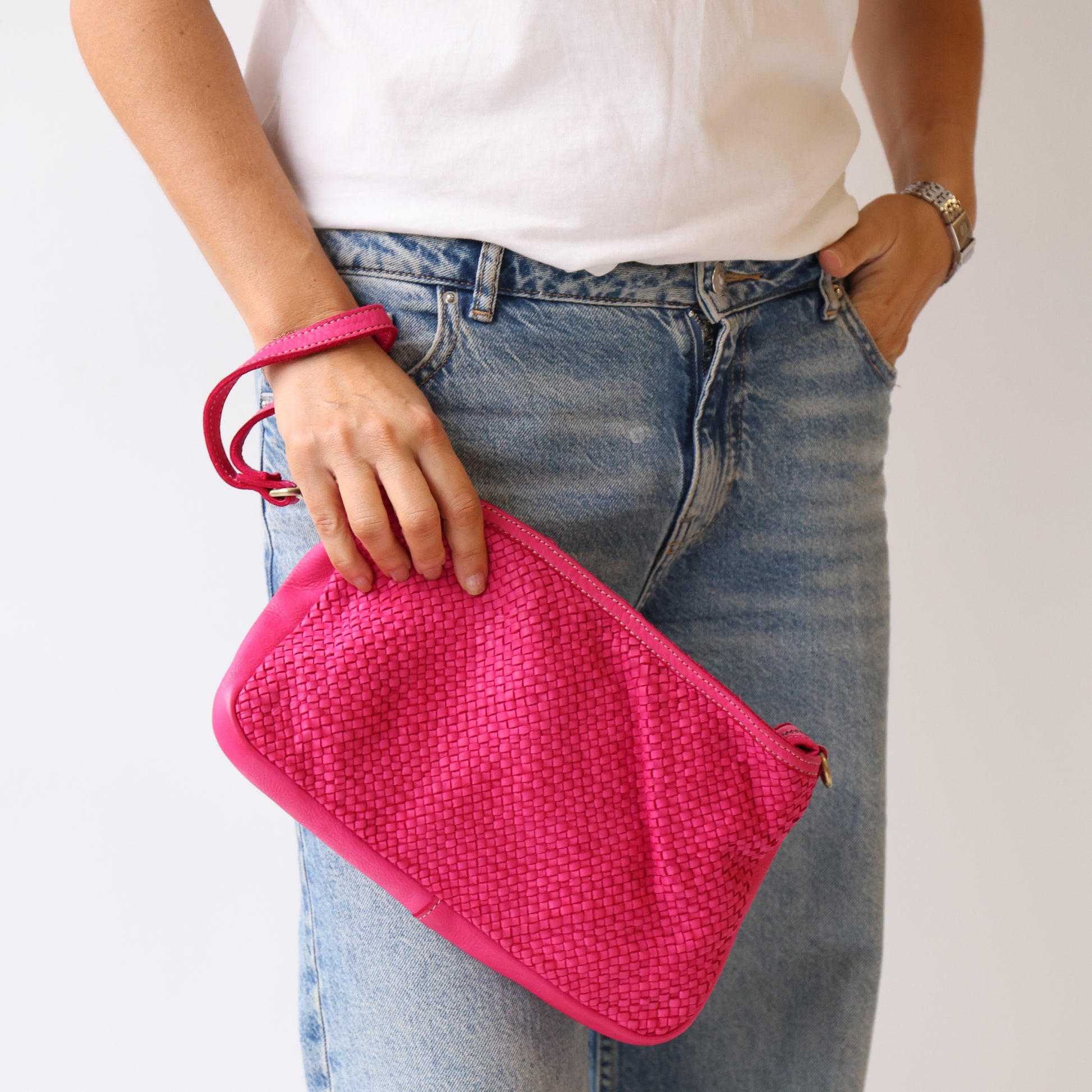 Elevate your everyday style with the Leisures NELLY Bag. Made in Italy from luxurious genuine leather featuring a chic woven design, this bag combines fashion and function. Carry it your way with the adjustable shoulder strap or the handy wrist band. Featuring secure external and internal zipper pouches, along with an internal pouch for easy organisation. Finished with a secure zipper closure.
