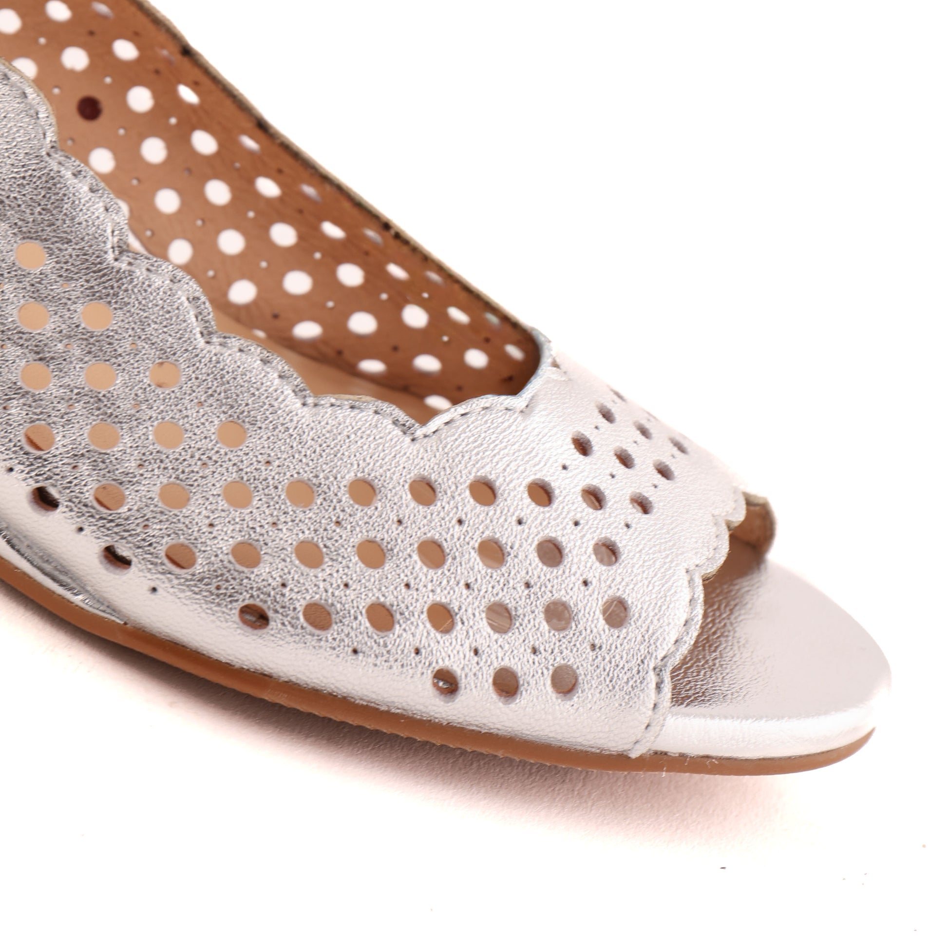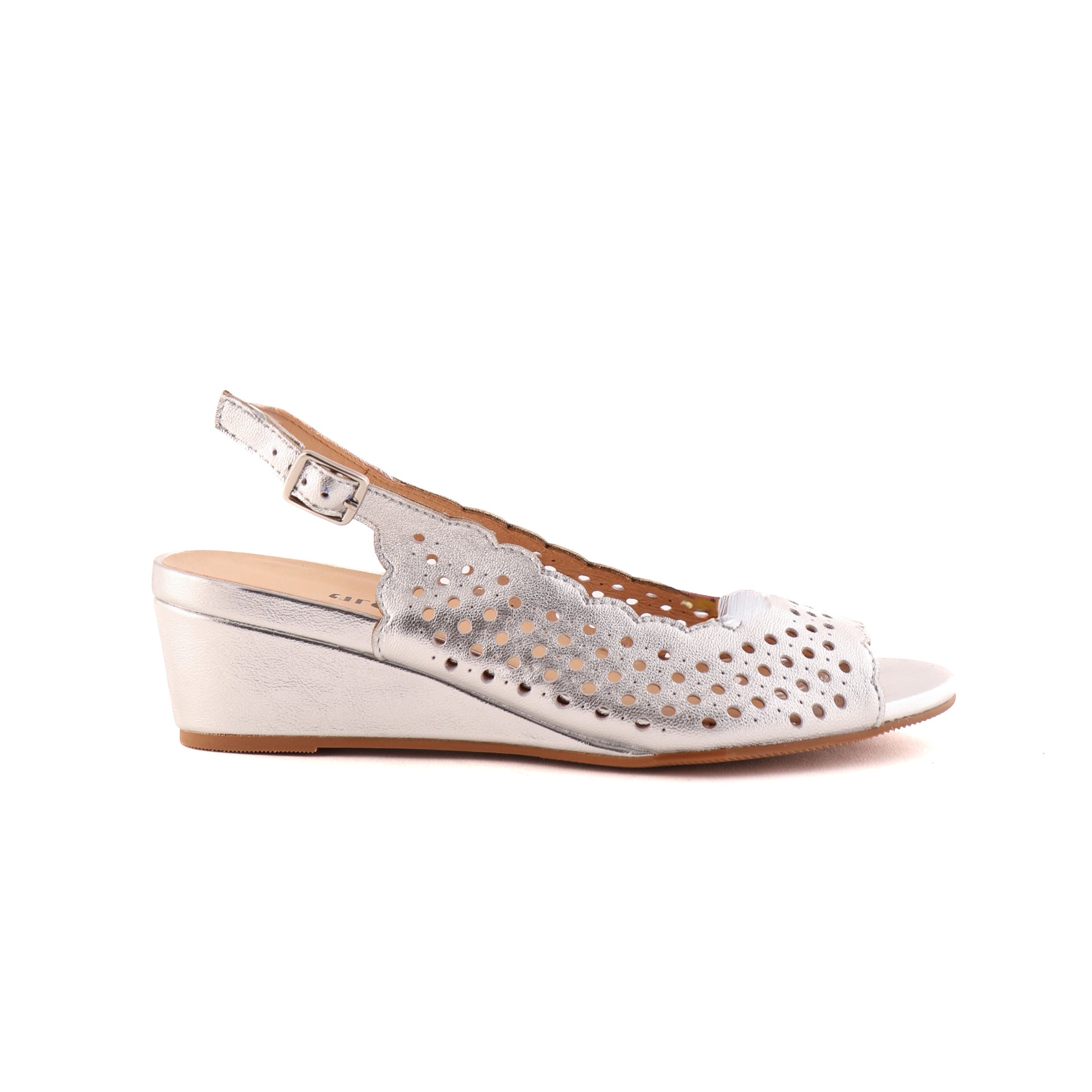 Experience comfort and style with the RAFFY Silver wedge. Featuring a perforated scallop-edged design and a soft leather upper, this shoe offers breathability and a gentle fit. The peep toe adds a touch of elegance, while the stacked heel provides sturdy support for all-day wear. Ideal for those seeking both fashion and comfort in one shoe.