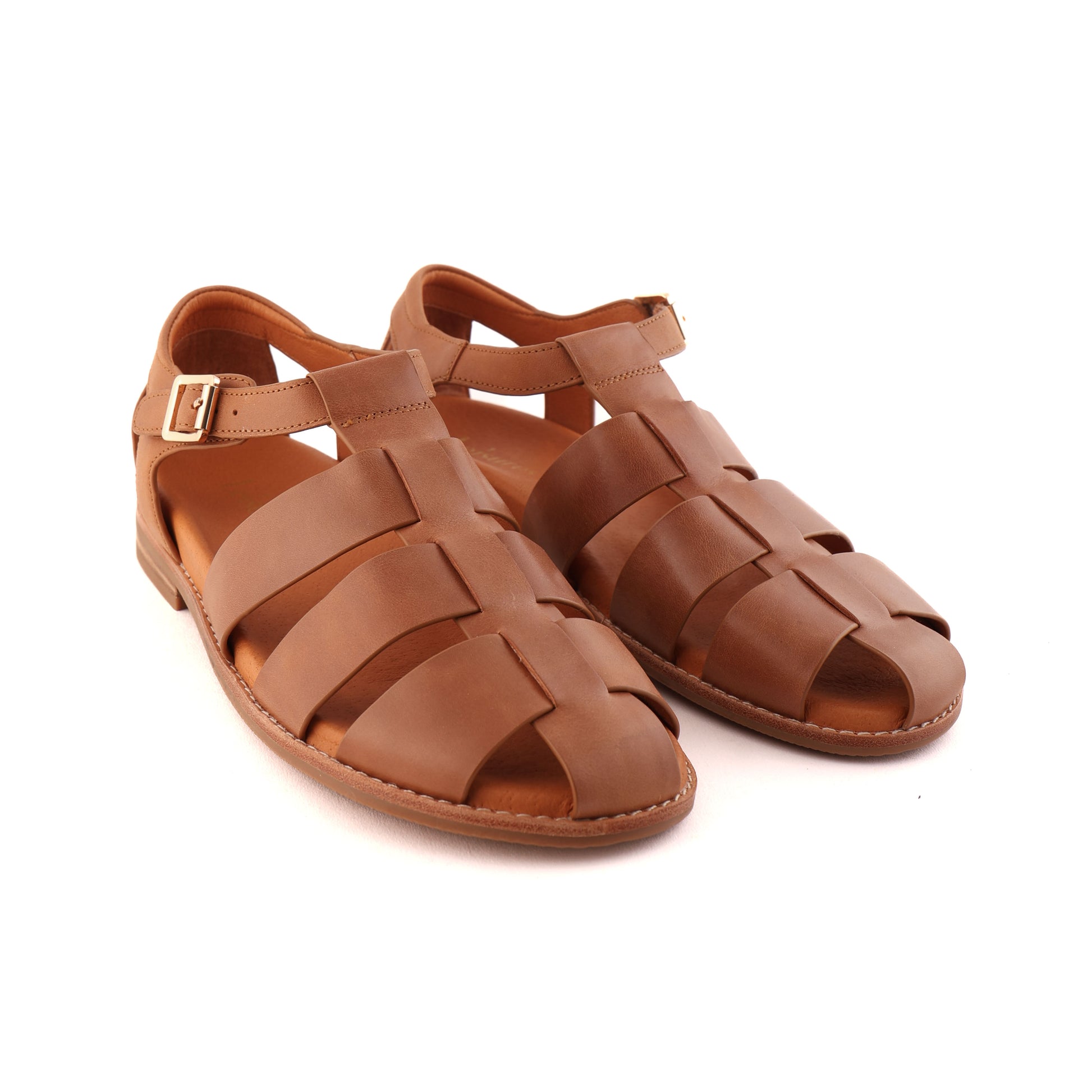 The RISHMAN Tan fisherman-style sandal offers secure coverage with a toe protector and a velcro strap designed to resemble a functional buckle, combining style and practicality. Its moulded footbed with a pocket back ensures comfortable support and keeps your foot stable throughout the day. Ideal for those seeking dependable footwear that balances protection and comfort.