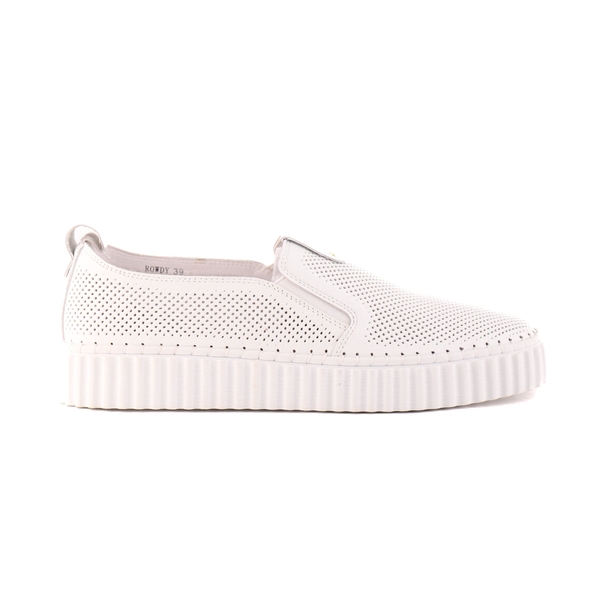 Add a touch of glam to your casual wardrobe with the ROWDY White Slip-On Sneakers. These stylish sneakers feature a perforated white upper for a chic and breathable design. The chunky white sole provides a comfortable and trendy platform, while the slip-on style makes them easy to wear.